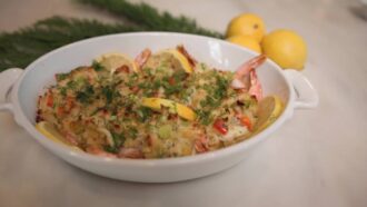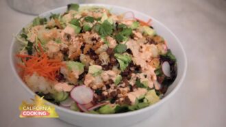 Jessica Holmes and her son Levi are making a flavorful and nutritious crispy rice salad with pickled cucumbers, crispy ground beef and a Sriracha mayo dressing.