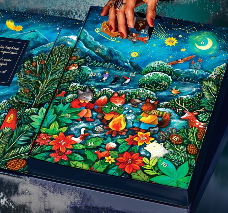 Gourmet chocolates hide behind imagery of foxes toasting marshmallows around a campfire in Compartes’ Winter Foxes Advent Calendar. Included are chocolates in flavors such as cinnamon bun, spiced gingerbread, creme brulee, linzer cookie and toasted pine nut.