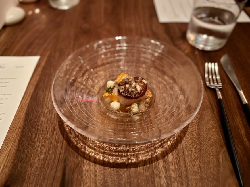 Food: Strictly speaking from a food perspective, Glovers Alley was my favorite Michelin-starred meal I’ve had. Each dish had an unexpected zing that truly wowed my taste buds. Take the scallop course, for example: It was spicy, acidic, deeply savory and slightly sweet. The beet “tartare” featured a thin layer of beet jelly encasing finely diced beets with crunch from hazelnuts and spice and acidity from mustard. Each dish was innovative, delicious, stunning and unlike anything I’ve tried before. Also, the portion sizes were perfect – I didn’t need a second dinner (unlike some tasting menus I’ve tried).