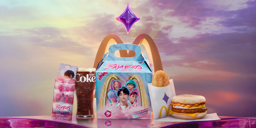 The boys are the stars of the breakfast version of the KPop Happy Meals. It features a Spicy Saja McMuffin (a Sausage McMuffin with Egg, topped with a peppery Spicy Saja Sauce), hash browns and a small soft drink.