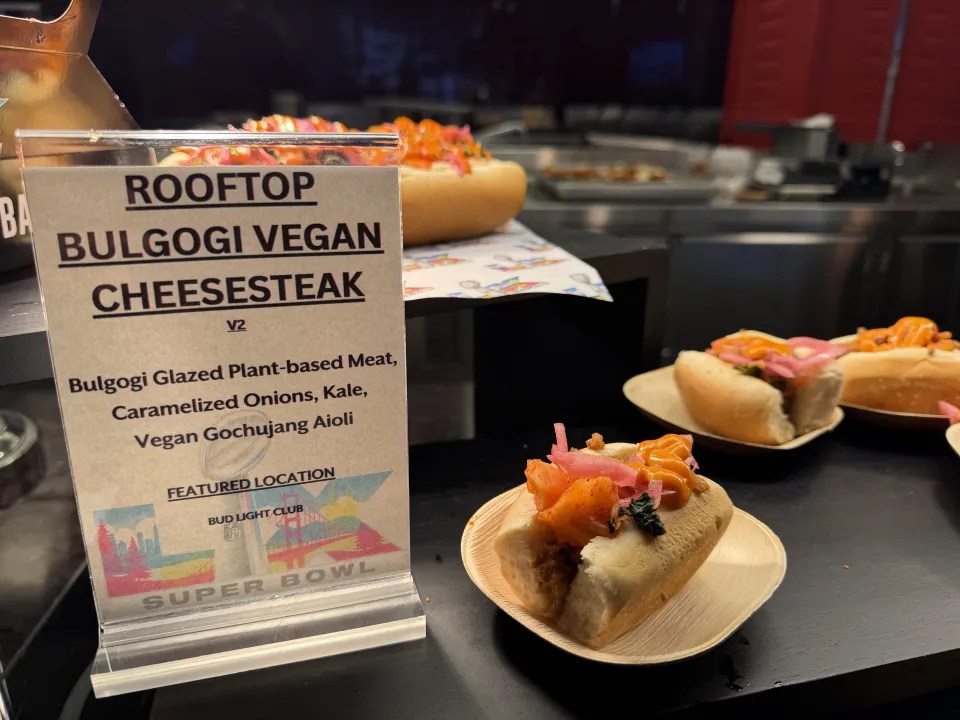 “Bulgogi glazed plant-based meat chopped up with caramelized onions, kale sourced from Levi’s Stadium’s on-site Faithful Farm, vegan gochujang aioli on a fresh roll.“